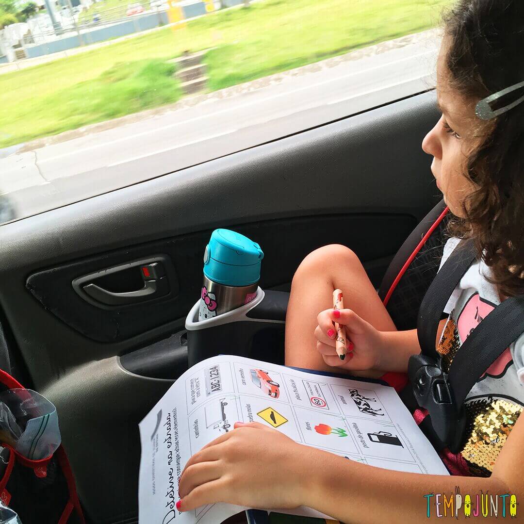 Primeiro, você pode estar se peguntando: como assim? Olha, essa brincadeira é super fácil e você só precisa imprimir as cartelas e levar canetas no carro ou no ônibus. O passo a passo de como brincar nós mostramos neste post aqui. As crianças maiores adoram e dá para as menores brincarem também.